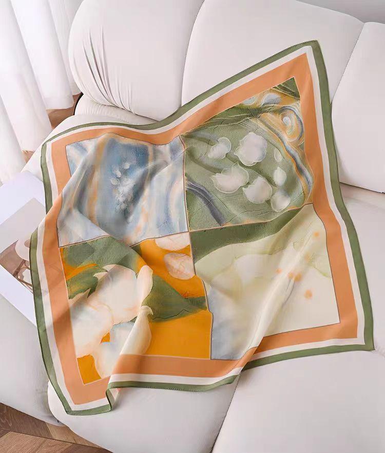 This is a silk scarf that is exceptionally rich in artistic feel and literary ambiance. Based on the image you provided, here is an analysis of its color palette, design elements, suitable wearing scenarios, and styling suggestions.
