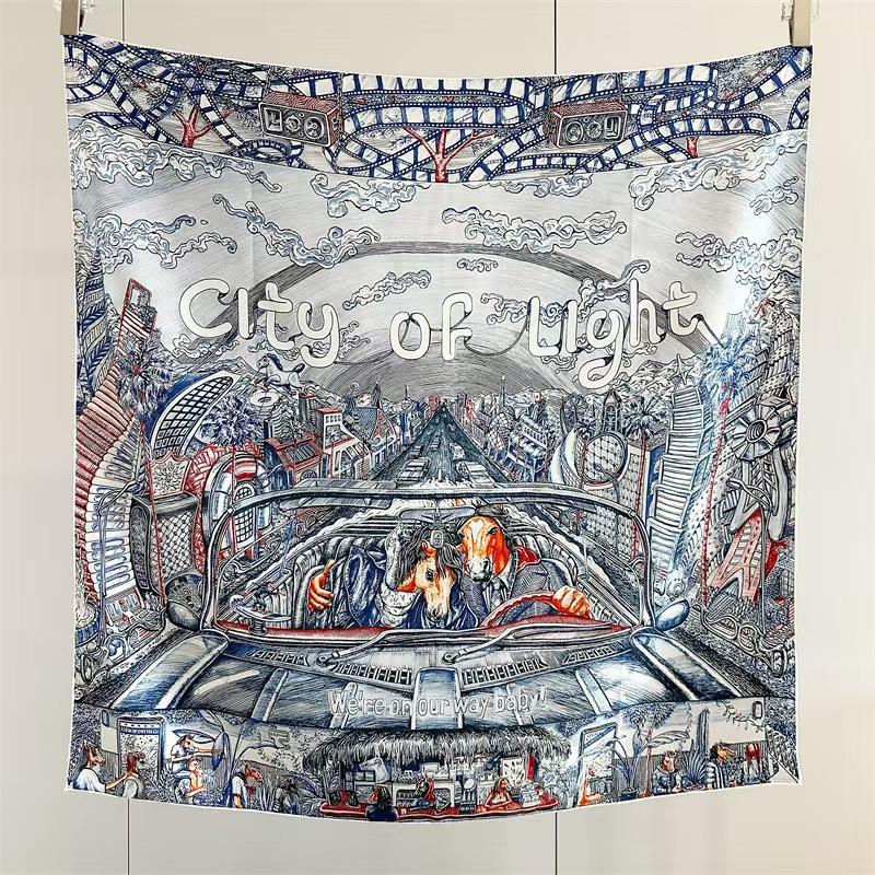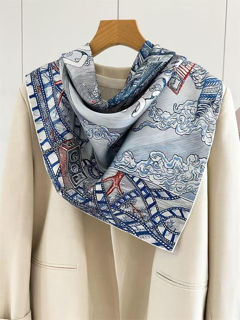The intricate design weaves together elements of vintage cinema—film reels, retro convertibles, and urban architecture—creating a wearable piece of art. Finished with meticulous hand-rolled edges, it offers a luxurious drape and a soft, luminous sheen. Whether tied as a classic neckerchief, a chic headwrap, or draped over a blazer, this scarf is the ultimate statement piece for the modern romantic.