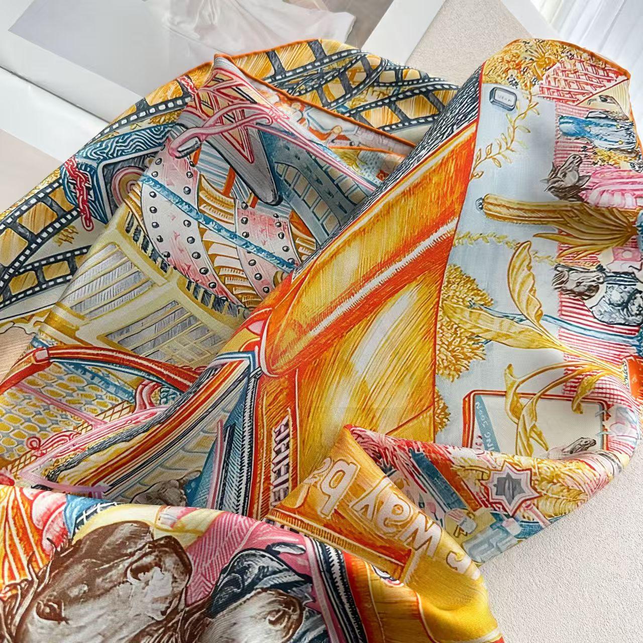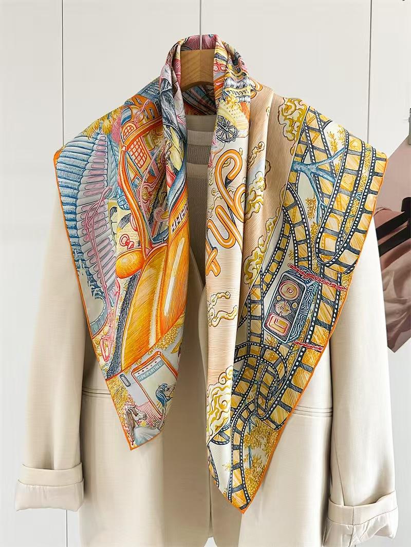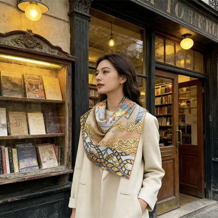 Woven on 100% mulberry silk twill at a substantial 14 momme weight, the scarf holds its shape beautifully while remaining light and breathable. Each edge is finished by hand with a meticulous rolled hem—a signature of true craftsmanship.